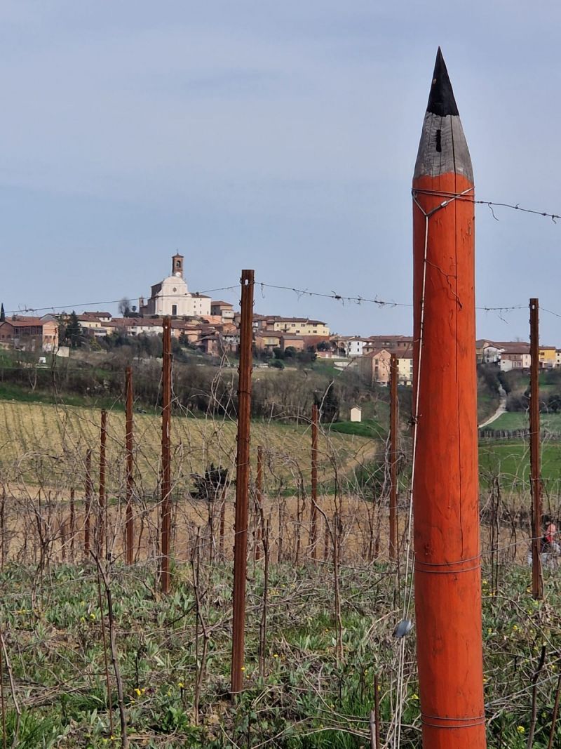 Si continua con alcuni bellissimi saliscendi sino all’incrocio con la provinciale 37 che si prende svoltando a destra, strada che porta direttamente a Portacomaro. Qui, all’altezza della cascina Durando, si incontra una curiosa installazione, il CiaBOT, struttura di design circolare realizzata in collaborazione con il Politecnico di Torino. Come un vero balcone sulle vigne, il CiaBOT ha delle sottili pareti realizzate con le doghe delle barrique. Accanto anche una delle installazioni del progetto Terremerse del Monferrato. Le sorprese non finisco qui: all’ingresso dell’abitato sulla sinistra si incontra la piccola chiesa romanica di San Pietro. Poco dopo si arriva al centro di Portacomaro riconoscibile per l’imponente facciata della chiesa di San Bartolomeo. Da Castagnole sono 7 km, percorribili in 30 minuti al netto di foto e selfie che vale la pena ricordare sempre vanno fatti in piena sicurezza, meglio con uno stick al limite da agganciare al manubrio.