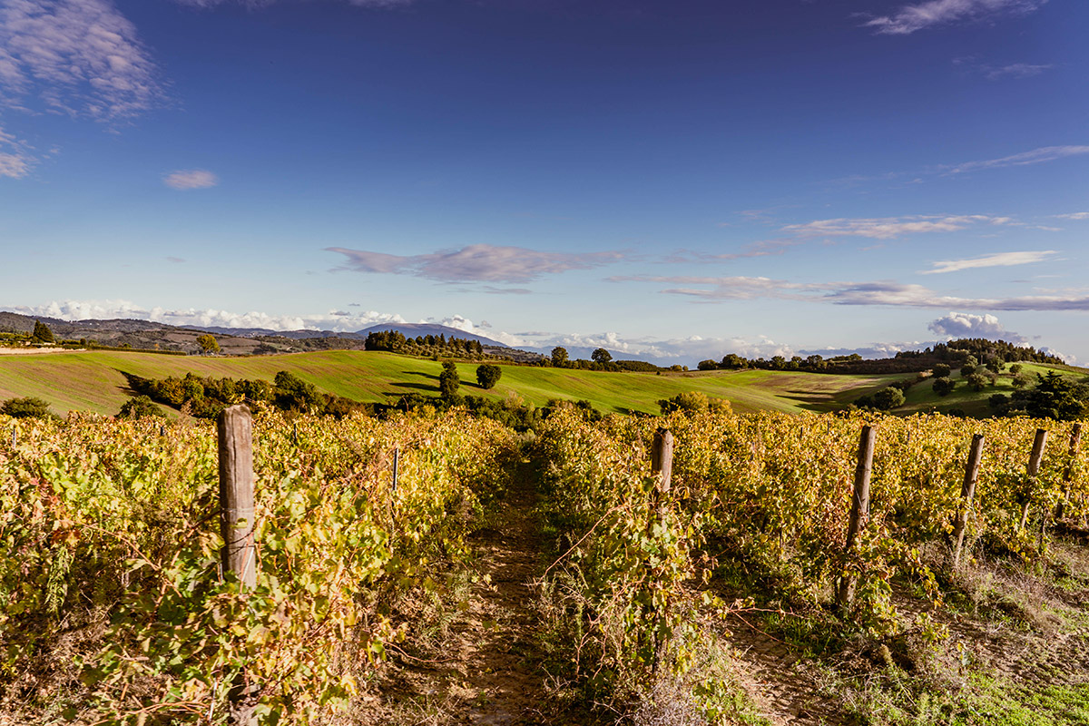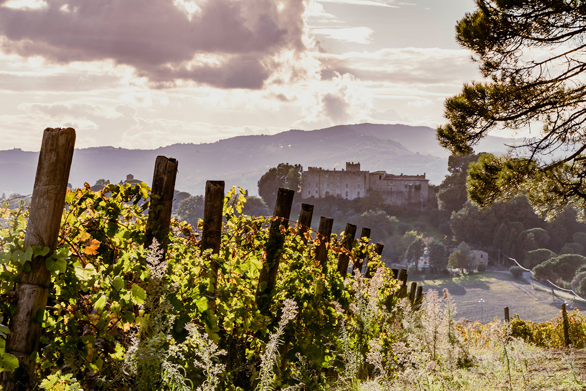 Il paese di Ramazzano (distante 15 km da Perugia e 13 km dall’aeroporto San Francesco d’Assisi) deve il suo nome all’omonimo castello, eretto nel XII secolo dalla famiglia dei Ramazzani. Ristrutturato nel tempo, conserva mura merlate alla guelfa, una torre, un cortile interno con pozzo comunicante con i sotterranei e appartamenti con stanze affrescate. Le antiche mura si affacciano sui vigneti di proprietà dei fratelli Aliani, discendenti di generazioni di coltivatori e legati fortemente al territorio, tanto da promuovere un progetto di recupero e di promozione del castello e delle cantine.