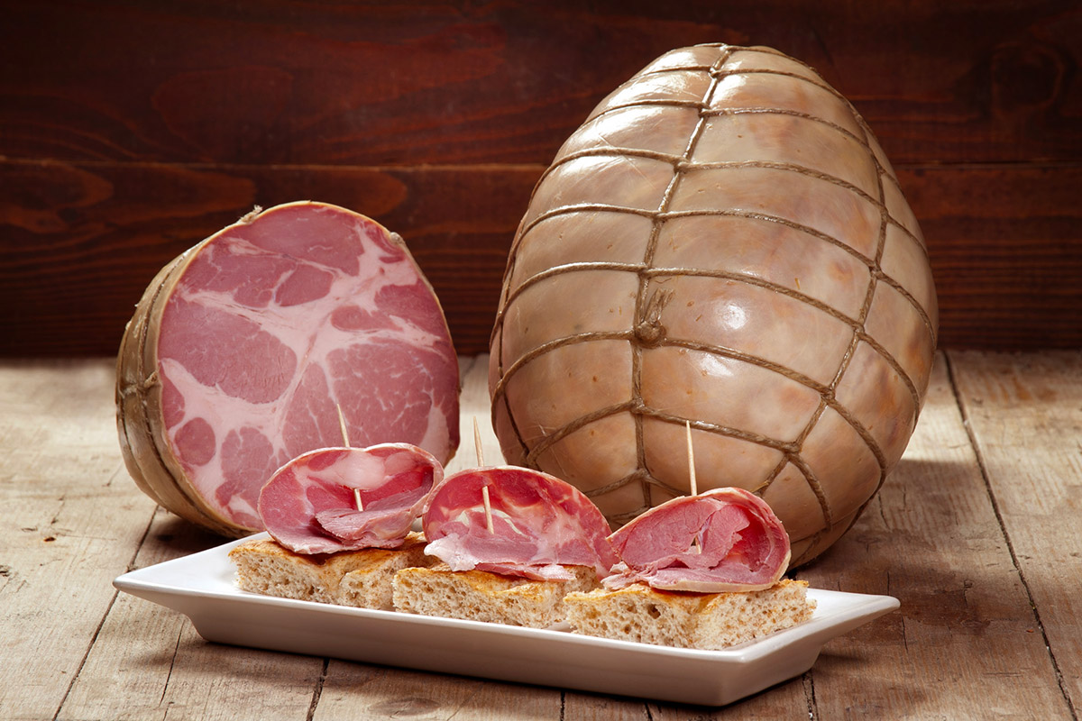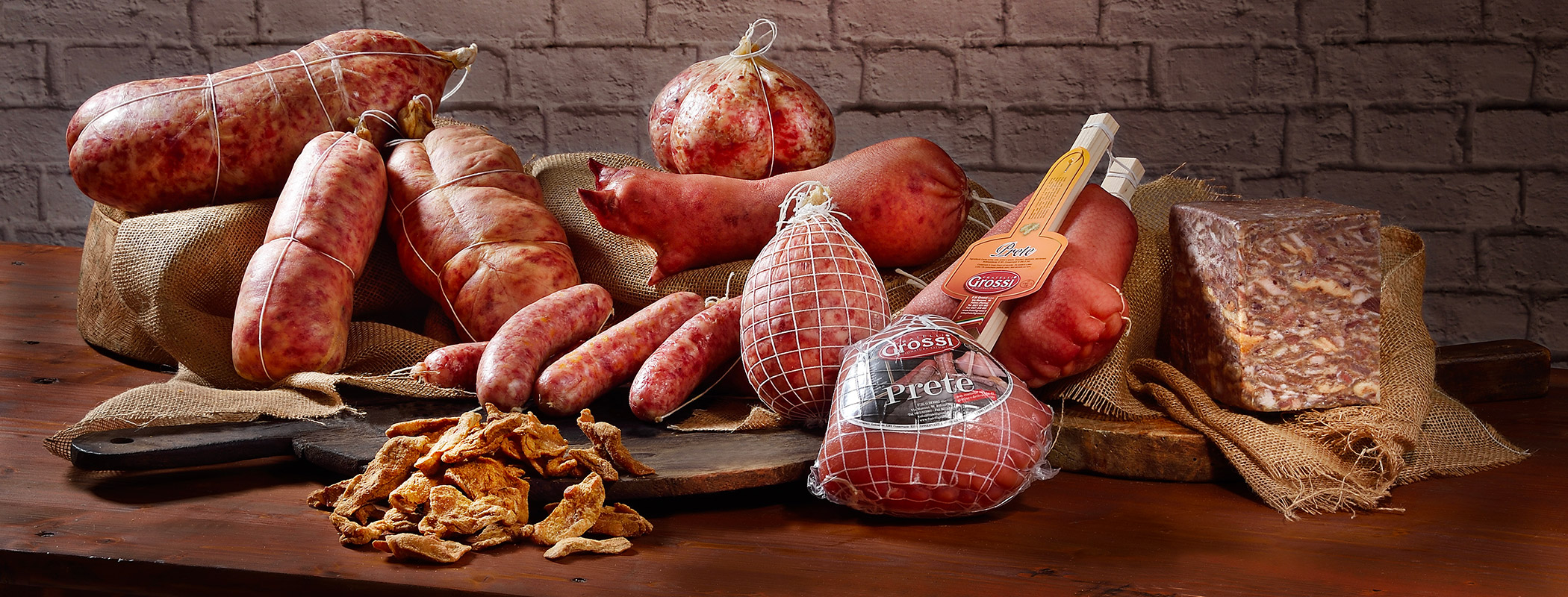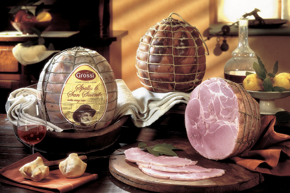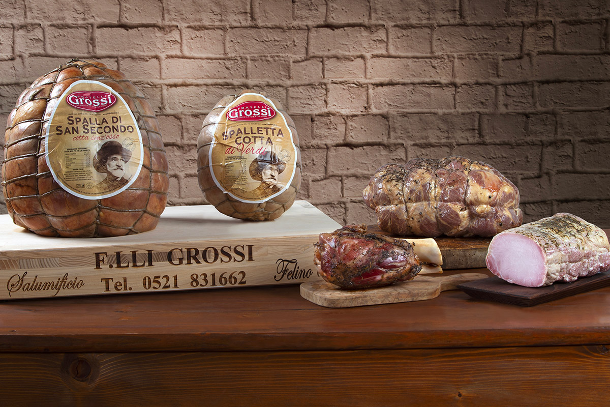 La Spalla cotta di San Secondo, vera e propria specialità dei fratelli Grossi, è realizzata con un taglio pregiato della carne, ottenuto mantenendo i muscoli della spalla del suino uniti alla scapola e alla coppa. La lavorazione viene fatta quasi completamente a mano. Rappresenta uno dei prodotti di punta di questa storica salumeria accanto a lonzino, strolghino e ai salumi da cuocere come cotechino e mariola.