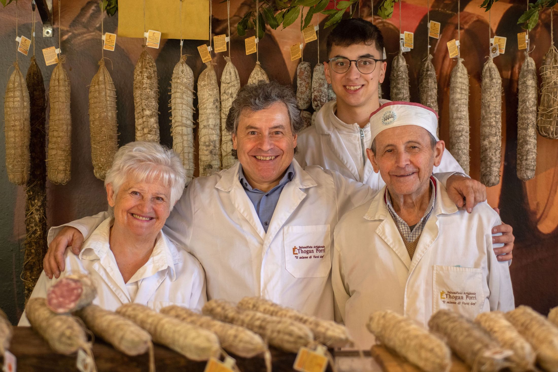 Accanto a questa eccellenza, il salame Cucito si distingue per la stagionatura estrema in doppio budello, che ne esalta la struttura e il sapore intenso. Nel negozio di famiglia si trovano anche Filzetta, cacciatorino, pancetta contadina, lardo stagionato Valle Staffora, coppa dell’Oltrepò Pavese, lonzino dolce stagionato e salumi da cuocere.