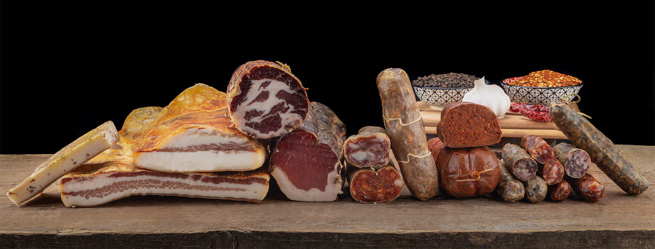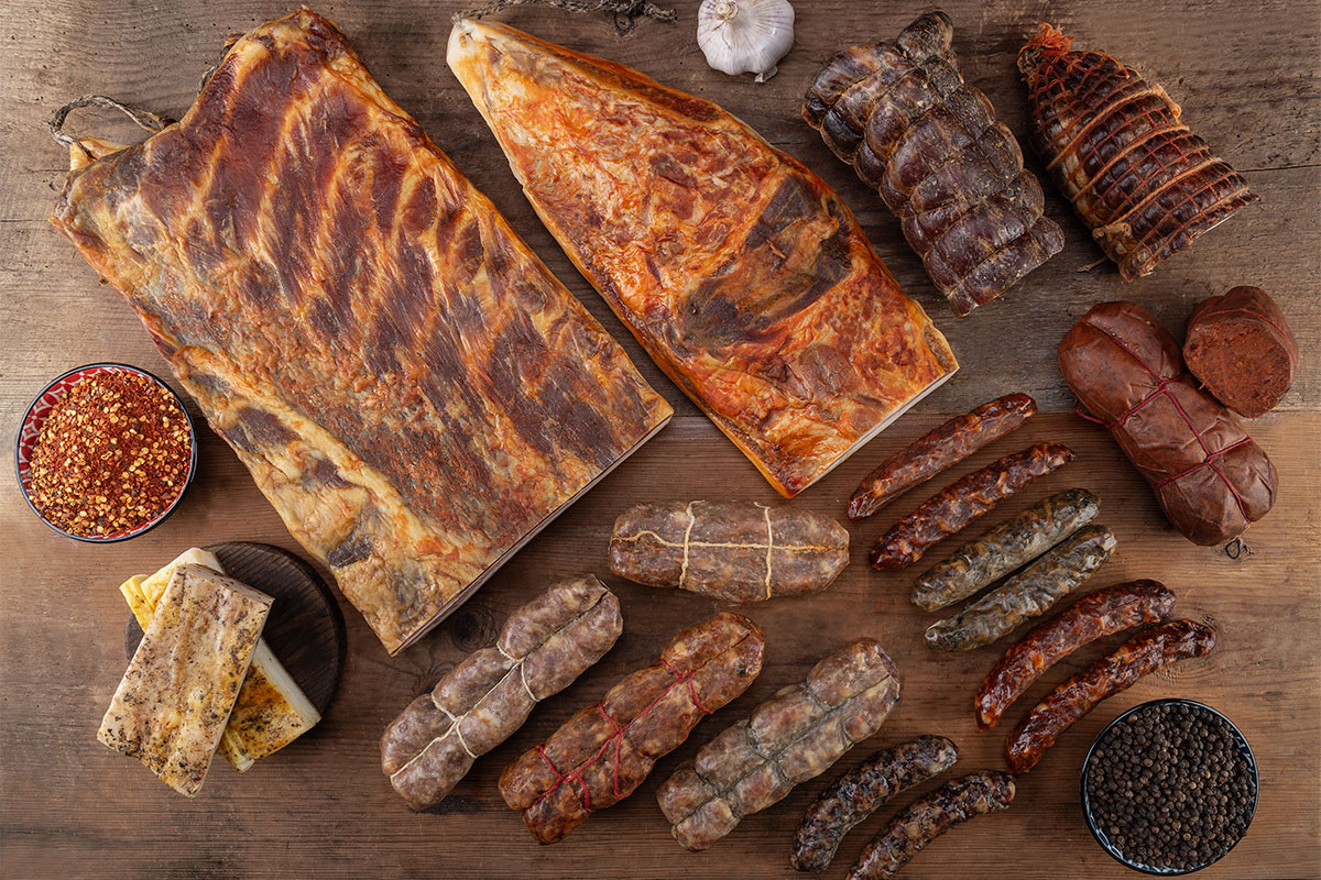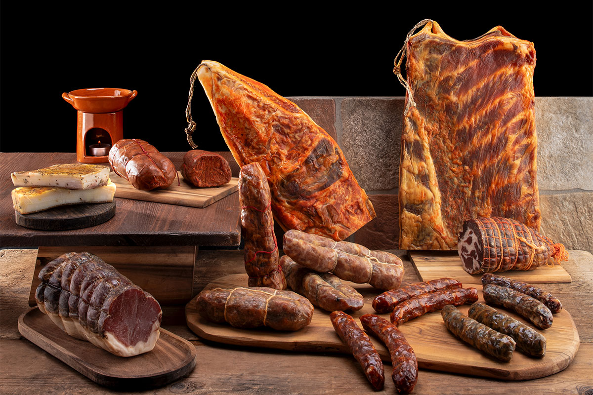 Ne derivano eccellenze come capocollo, salsiccia (in più varianti), guanciale, lardo, pancetta e la classica ‘nduja. La soppressata viene proposta anche in una versione dolce o nella variante bianca con pepe nero in grani. Un omaggio alle usanze di un tempo è la “Quadrara”: antica tecnica di bollitura delle parti grasse del maiale da cui oggi nascono i Grassi e ciccioli, e una particolare gelatina di carne cotta direttamente in vasetto.