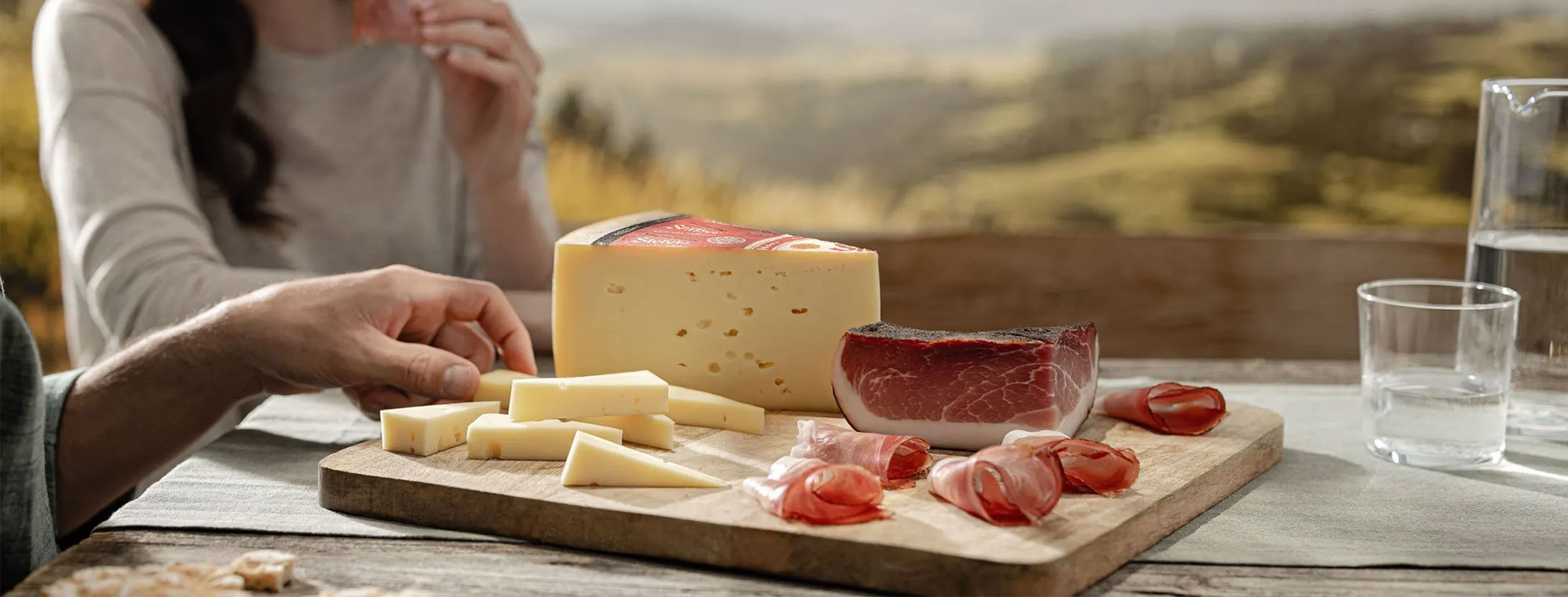 Le tipicità dello Speck dell’Alto Adige sono il gusto saporito e leggermente aff umicato: solo lo speck migliore riceve lo storico marchio a fuoco. Il Formaggio Stelvio DOP ha ricevuto nel 2007, unico formaggio dell’Alto Adige a vedersi riconoscere il marchio di qualità, la denominazione di origine protetta dall’Unione europea. Il marchio garantisce qualità nel rispetto della tradizione e delle origini storiche e geografi che: la produzione dello Stelvio è documentata sin dal 1914. Si tratta di un formaggio tipico della regione, stagionato per almeno 60 giorni. Per ottenerlo viene lavorato latte vaccino fresco proveniente da masi alpini, la maggior parte dei quali è situata a oltre 1.000 metri di altitudine, entro 48 ore.