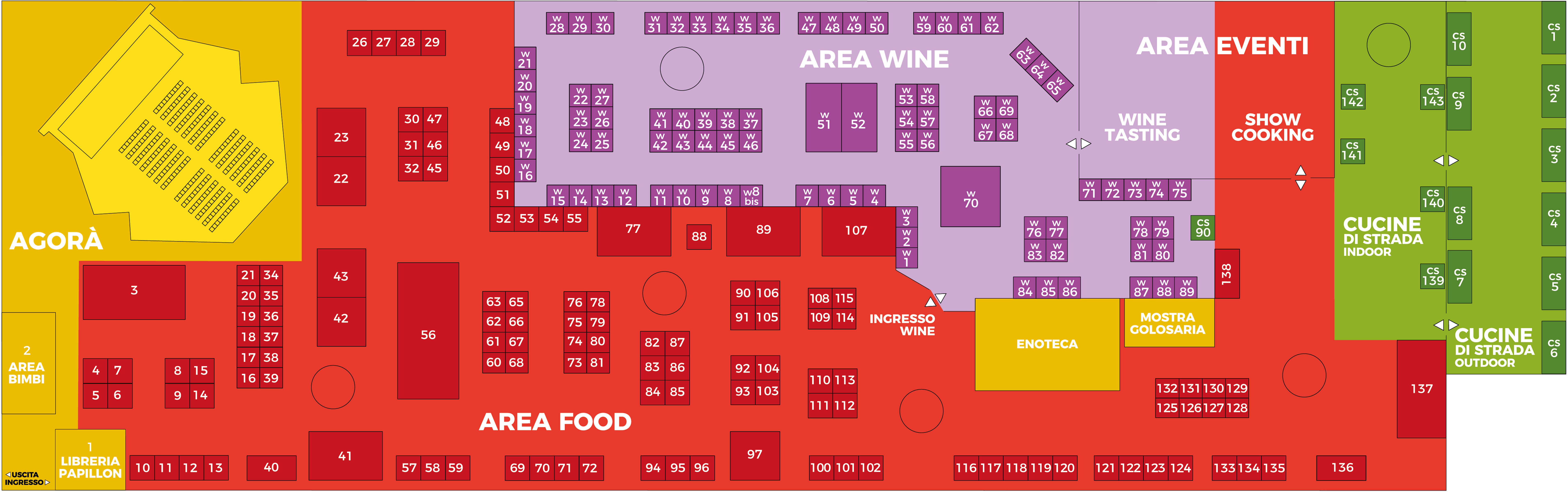 Per gli eventi che si svolgono nell'Agorà, Show Cooking, Wine Tasting e Area Bimbi non occorre prenotazione. Ingresso fine ad esaurimento posti (si consiglia di presentarsi con qualche minuto di anticipo per prendere posto). Si ricorda che i Wine Tasting si svolgono all'interno dell'Area Wine e che occorre essere muniti di Bicchiere di Golosaria. Al termine di ogni evento, è necessario sgomberare la sala per permettere l’allestimento per l'evento successivo.